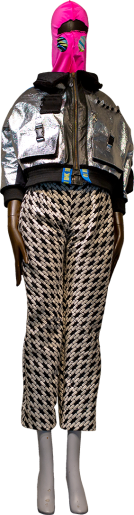 Leilah Talukder utilizes textiles, wearables, and sculpture to explore the role they play in shaping human interactions, desire, and cultural power dynamics. For her exhibition at Recology, Talukder presents a line of wearable pieces that can act as tools in protests for social justice and as resistance against the ever-increasing ubiquity of facial recognition technologies. Fashioned from materials sourced from the Recology Reuse and Recycling Area, Talukder suggests a model for how audiences might create their own jackets, jumpsuits, masks, and vests from what they have available. Rather than opting for the somber, monochromatic designs or high-tech anti-surveillance solutions often used in protest gear, Talukder wields bright colors, contrasting patterns, and repurposed materials in her pieces. Inspired by “dazzle camouflage”—an irregular geometric, black & white pattern that disrupts itself, making the covered object difficult to properly perceive—her work simultaneously embraces tactics of hypervisibility and anonymity. The idea is not to disappear into the background but to make collective action for justice unmistakable.