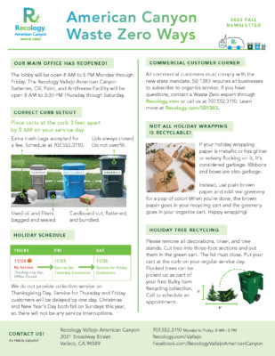 Waste Zero Ways is the newsletter from Recology American Canyon, offering the latest information about the recycling programs for our residential and commercial customers. For more information, please visit our Customer Newsletter page.