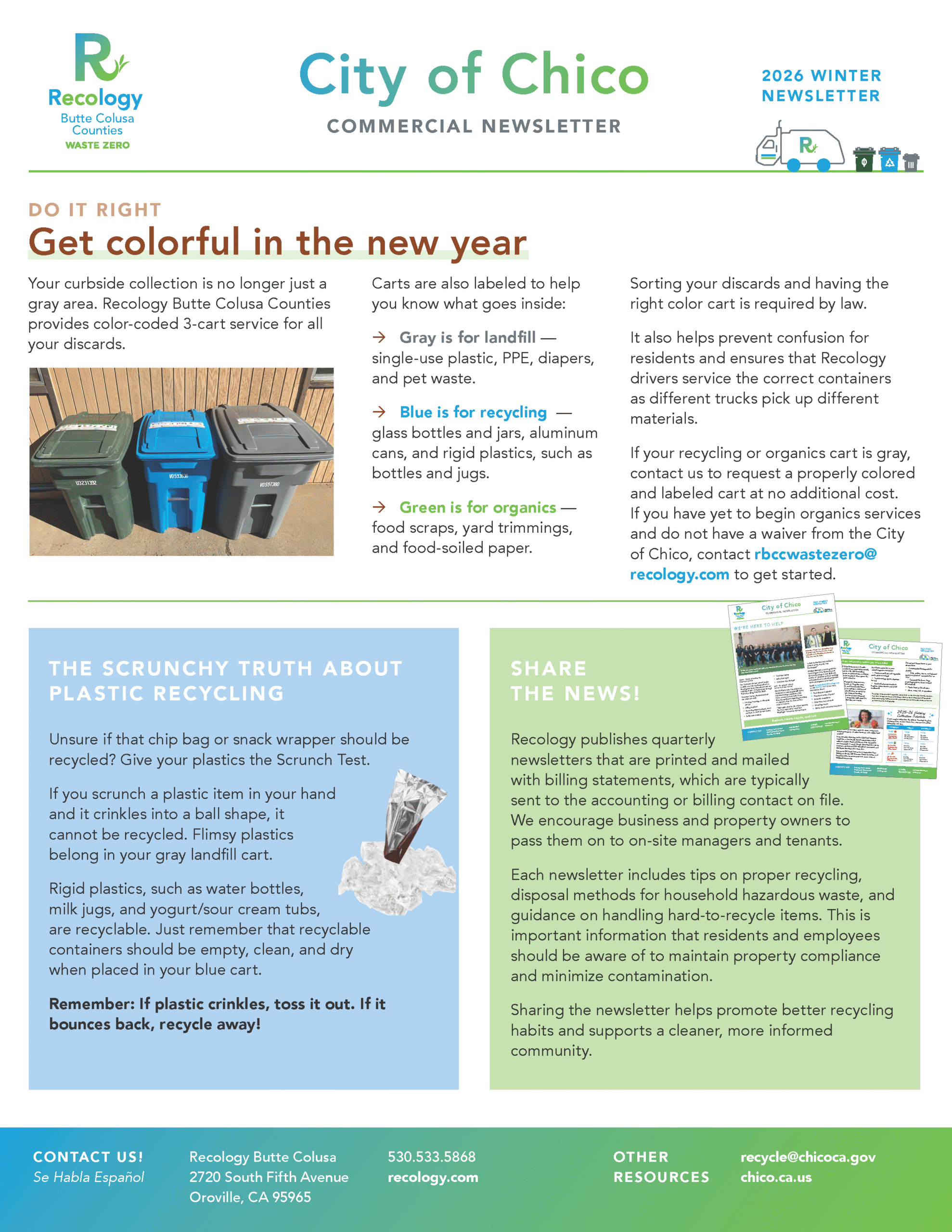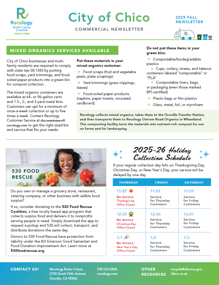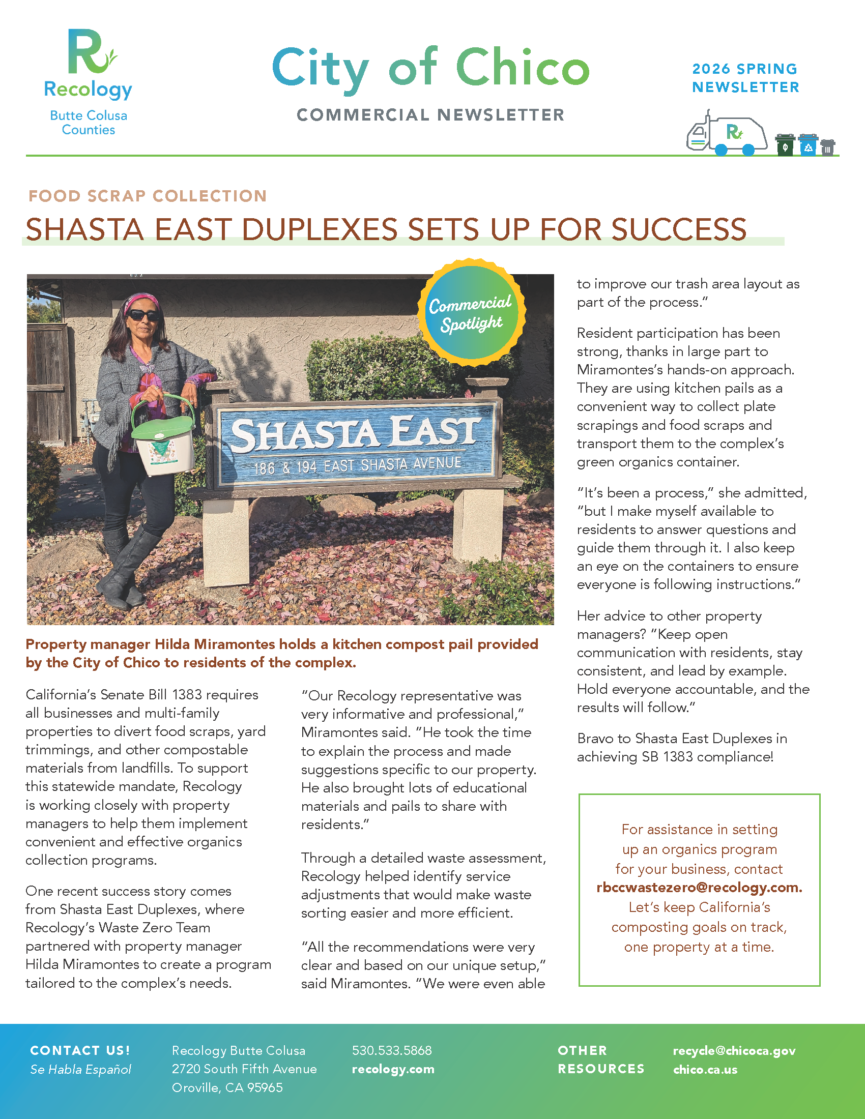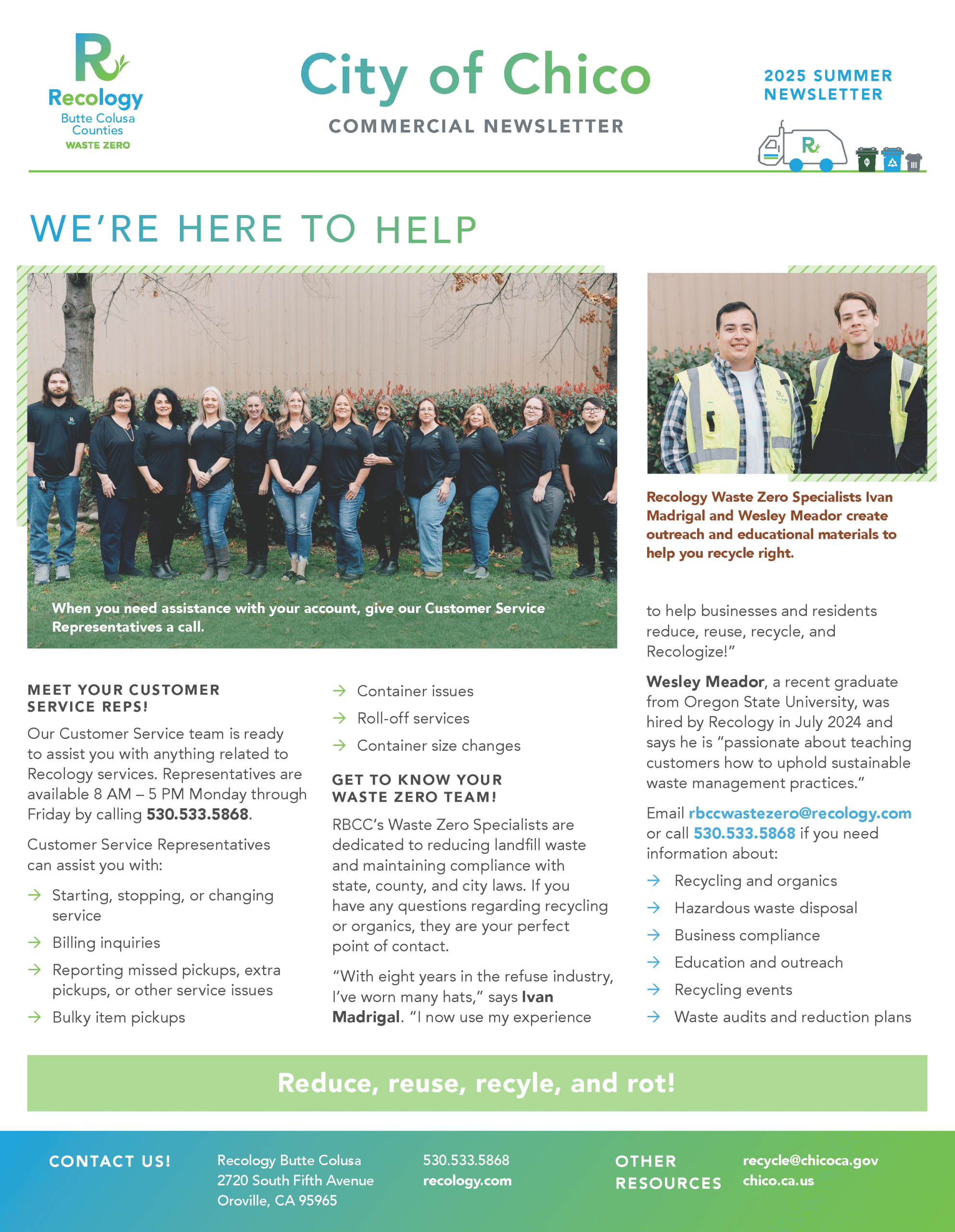 CUSTOMER SERVICE OFFICE Please be advised, our Customer Service Office at 2720 South Fifth Avenue Oroville, CA 95965 is temporarily closed to all walk-in customers as a precautionary safety measure for our employees. Payments can be made online at Recology.com or by phone 530.764.2102. TRANSFER STATION & HHW FACILITY Our Household Hazardous Waste Facility is […] Read more