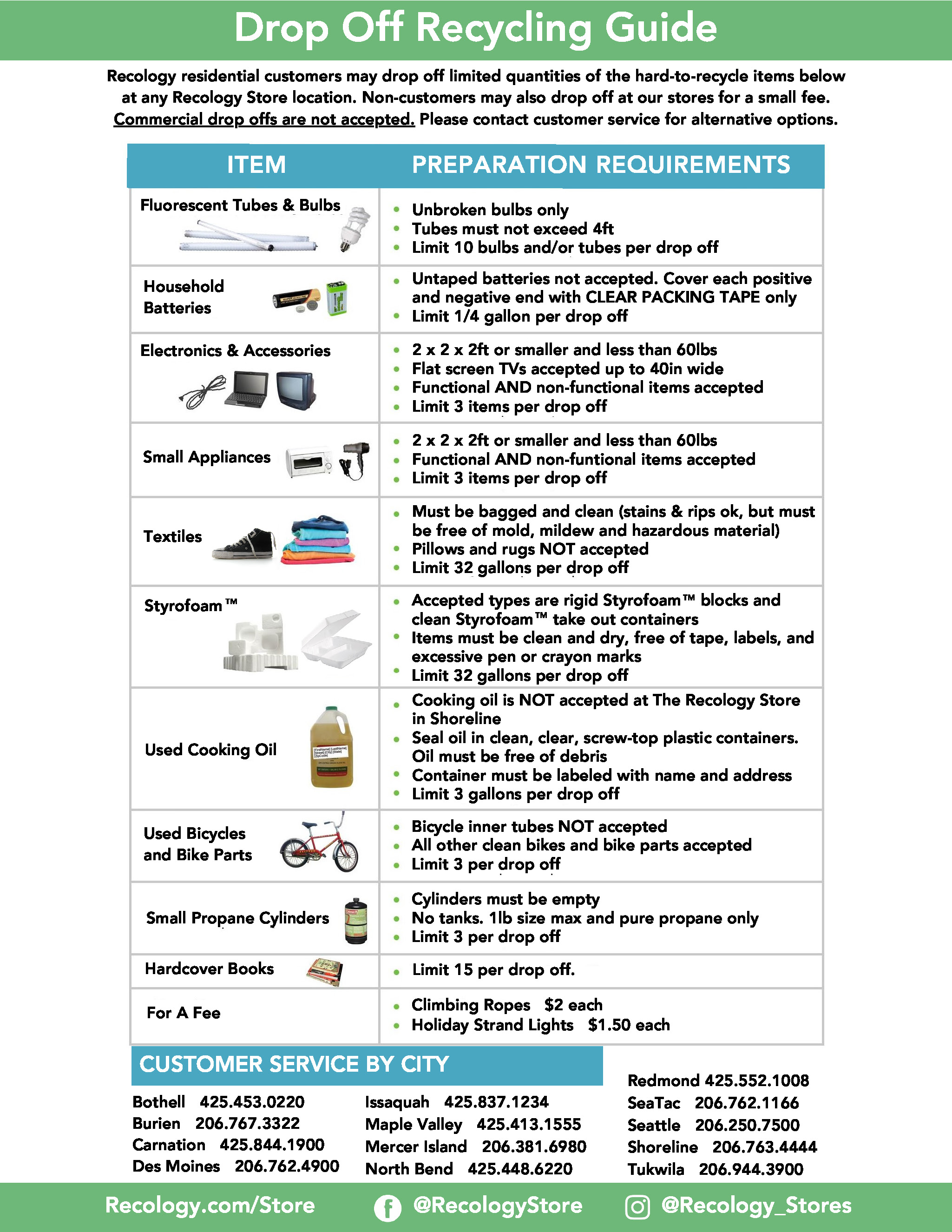 If we pick up at your house, you can drop off at our store! Recology King County residential customers may drop off limited quantities of our accepted hard-to-recycle items at any Recology Store location.