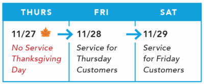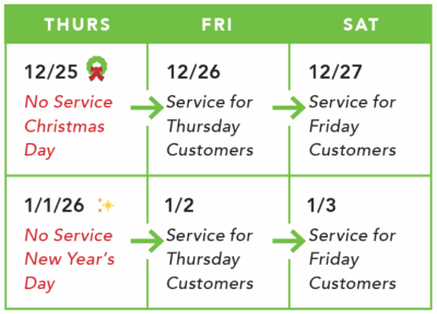 Collection occurs on all holidays except Thanksgiving, Christmas Day, and New Year’s Day. If your trash collection day falls on or after one of these holidays, your service will be impacted. View the Collection Calendar or visit MountainView.gov/CollectionCalendar for more details.