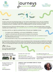 Our Journeys to Zero Waste Residential Newsletter is the best source for information on how to recycle, reduce waste, reuse, compost, and properly dispose of household waste for Recology San Benito County residential customers. Review our current and past newsletters here!