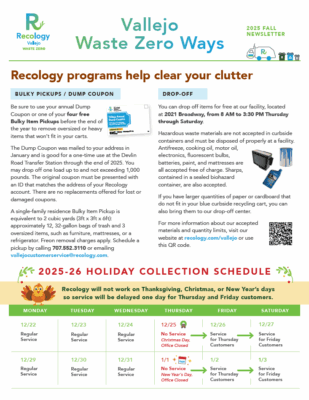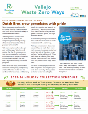 Our newsletters are your one-stop shop for Recology’s most recent updates and information for all our Vallejo and Vallejo Unincorporated customers.