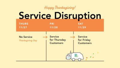 As reminder, residents and businesses with garbage, recycling, or compost pickup on Thursdays and Fridays will have adjusted schedules this week. We will not be providing service on Thanksgiving Day, Thursday, November 27th. Thursday customers will be rescheduled to Friday, November 28th, and Friday customers will be rescheduled to Saturday, November 29th.