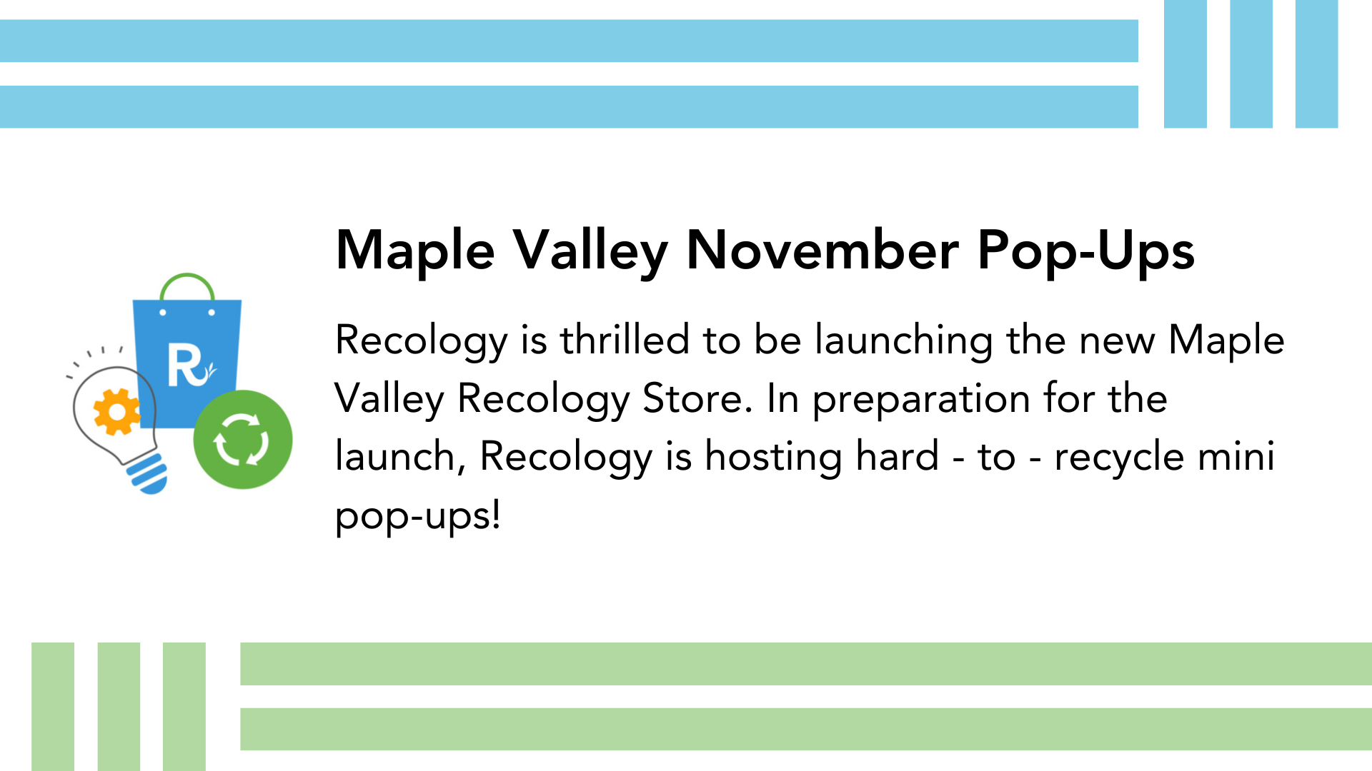 Our hard-to-recycle pop-ups are continuing through November! Please see information below for the upcoming opportunities for residents as we await the launch of our new Maple Valley Recology Store.