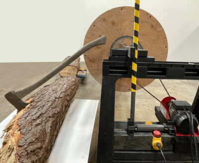 Mark Brest van Kempen’s Mechanical Mambo: Possession and Dispossession in the Material World is a kinetic sound sculpture that traces the long arc of material history often hidden within mundane objects. The project centers on a large-scale percussion instrument that resembles the ghostly approximation of a felled tree. This pieced-together assembly tells the narrative of nation-building economics: “a tree can’t be cut down until you own the property.” The segments of the sculptural tree evoke stages in the process of creating wooden commodities–the natural landscape must be claimed, named, and divided into parcels to be extracted from; an ecosystem of forests must be razed and turned into logs, graded and planed into lumber, and shaped with a lathe into parts for objects like a chair. This is a song of partitions and segmentation, binaries of nature and the built environment, property and the wilds, and resources to be consumed or set to the side for preservation. Each stage of the process has been enabled by systems of labor and knowledge that are hidden within everyday things.
